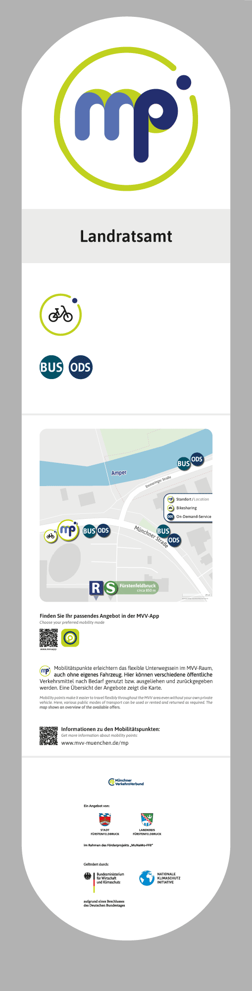 Das Herz der Mobilitätspunkte sind Informationsstelen, die die verfügbaren Mobilitätsangebote anzeigen und deren Auffindbarkeit sowohl im Straßenraum als auch digital erleichtern. Unter dem MP-Logo vereint, werden so Mobilitätspunkte im ganzen MVV-Raum sichtbar. Die Nutzung von einheitlichen Logos und Stelen hilft Fahrgästen Mobilitätspunkte überall zu finden und Shared Mobility zu nutzen; unabhängig vom Anbieter der Angebote.