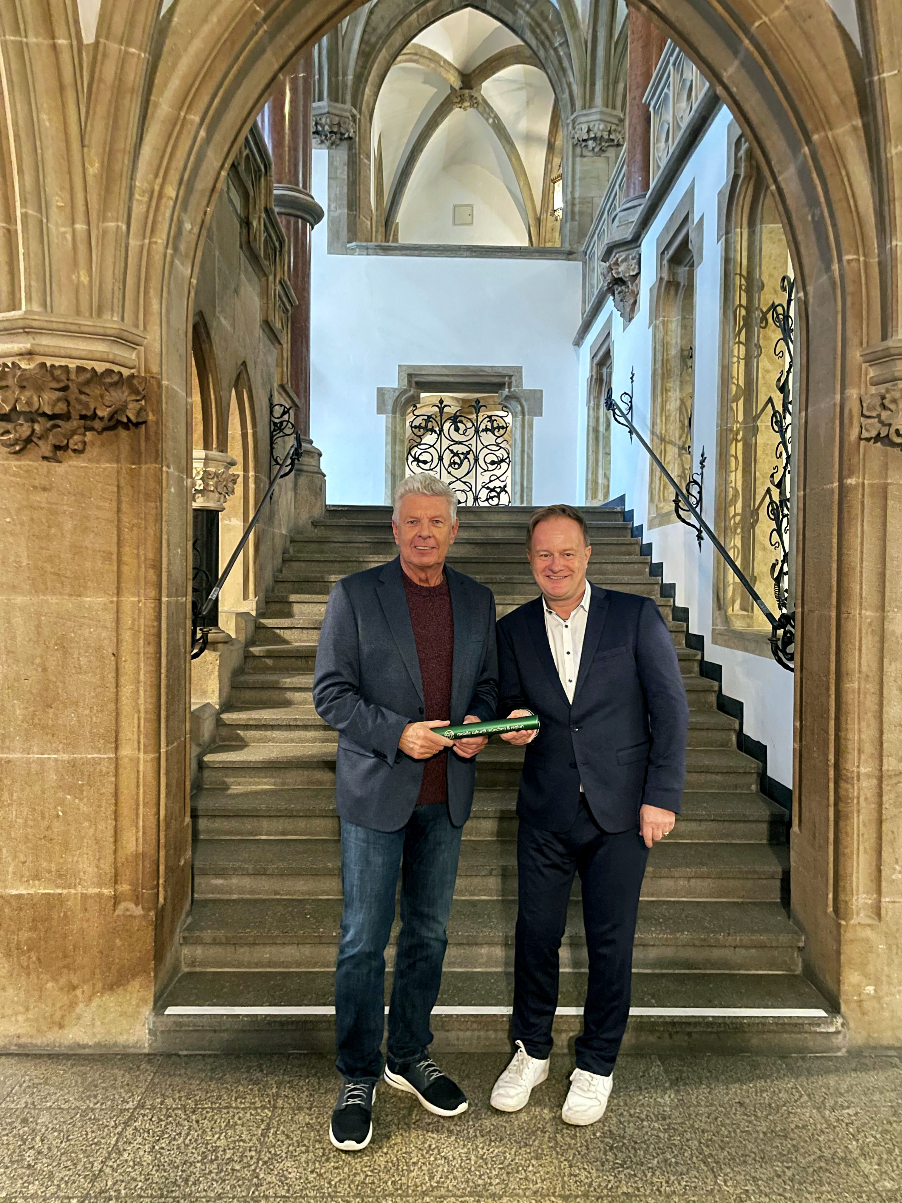 Symbolische Übergabe der MZM-Sprecherrolle: Münchens Oberbürgermeister Dieter Reiter übergibt den “Staffelstab” an Robert Niedergesäß, Landrat des Landkreises Ebersberg und Sprecher der MVV-Verbundlandkreise. © MVV GmbH (jpg, 1,73 MB)